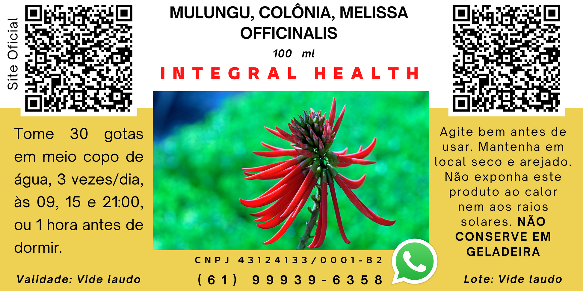 A INTEGRAL HEALTH assume o compromisso de manter 100% a pureza de seus produtos, esforçando-se para garantir a utilização de imagens e informações, alterações na fabricação de embalagens e/ou, as quais podem, eventualmente, aparecerem pendentes de atualização no marketplace ou em nosso site. Embora os itens possam ser enviados em embalagens alternativas, o frescor sempre será garantido. Deve ficar claro para qualquer pessoa de inteligência mediana, pelo menos, que os anúncios de nossos produtos não propõem o completo de diagnósticos, tratamentos ou aconselhamentos médicos. As informações fornecidas na plataforma do Mercado Livre servem apenas para fins informativos. Por favor, sempre consulte um profissional de saúde, apto para aplicações de medicina integrativa, nutrólogo, naturopata, fitoterapeuta, nutricionistas que adicionaram em seus currículos conhecimentos de dieta ortomolecular e plantas medicinais, caso preciso de opções de tratamento ou diagnóstico médico ou de saúde. As informações sobre os produtos não substituem o aconselhamento desses profissionais. As afirmações sobre produtos específicos, feitas especificamente nesta plataforma, não devem ser entendidas como diagnóstico, tratamento, cura ou prevenção de doenças. Se você estiver usando medicamentos químicos, recomendamos que leia as bulas, rótulos, avisos e instruções de todos os produtos antes de usá-los e que não confie apenas nas informações contidas nas bulas de medicamentos produzidos pela indústria farmacêutica em geral. Isso é de fundamental importância para que se evitem os efeitos colaterais, cujas consequências poderão ser fatais para a saúde do paciente. Uma simples leitura da bula de medicamentos prescritos por um médico poderá evitar o surgimento de novas doenças e suas consequências fatais.